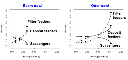 Biomass of each functional group at increasing fishing intensities: beam trawl and otter trawl.