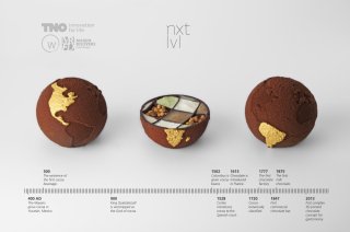 Together they created a dessert composed of three globes, printed from different kinds of chocolate. Each chocolate’s origin was depicted by highlighting its continent – North America, Africa, or South America - in gold on the outside of the globe. The globes were hand-filled with a range of flavours that again reflected the chocolate’s origins: a cream of sweetened corn and Bourbon whiskey for North America, allspice and popcorn for South America, and ras el hanout - with cumin and yogurt - for Africa.