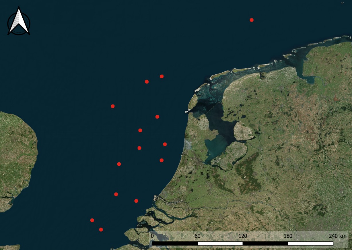 We make use of a monitoring network of fourteen bat detectors, which are deployed at various offshore platforms and wind farms.