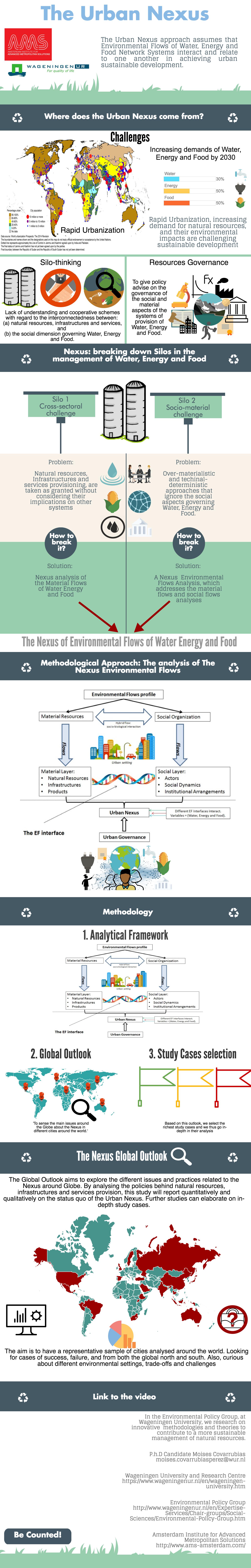Urban planners have, however, often treated resources such as WEF as separate domains. What is missing is an ‘Urban Nexus’ perspective which assumes that Environmental Flows of WEF Networks interact and relate to one another in achieving urban sustainable development. This research seeks to contribute to theorize this Urban Nexus and to make it analyzable to help reduce its complexity and obscurity to policy-planners, producers and consumers. It will offer an analytical framework to study the Urban Nexus of resources such as WEF through a more social and material Environmental Flows Analysis. The material analysis will show the processes and flows in which WEF Network Systems go through, giving special attention to (1) resources inputs, (2) infrastructure, and (3) consumption goods. Thereafter, the social (non-material) analysis will focus in-depth on how (1) social dynamics (2) actors, (3) and institutional arrangements come together in the scene of WEF Networks Systems and their Urban Nexus. Both, the theoretical and methodological framework are applied to study cases in order to gather a more empirical basis for the Nexus research.