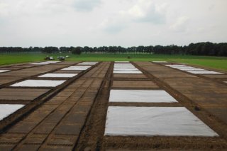 Afdekken met luchtdichte folie (links) in proefveld met onafhankelijke herhalingen (rechts).