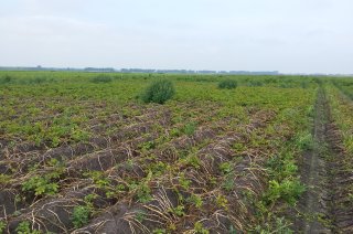 Ook in dit extreem droge, warme jaar zien we de langjarige meerwaarde van de Tagetesteelt. Op de foto een perceel met Seresta zetmeelaardappelen. Voorop een veldje waar voorafgaande aan de aardappelen géén Tagetes heeft gestaan en daarachter een veldje waar drie jaar geleden, in 2015, Tagetes is geteeld. Het loof op het veldje met Tagetes is aanmerkelijk groener en bij het optrekken van enkele planten zagen we duidelijk grotere knollen. Blijkbaar zijn planten die minder last hebben van wortellesieaaltjes beter bestand tegen de extreme weerscondities van de afgelopen maanden. Een definitief oordeel over de opbrengst met en zonder Tagetes kunnen we vellen na de oogst over enkele weken.