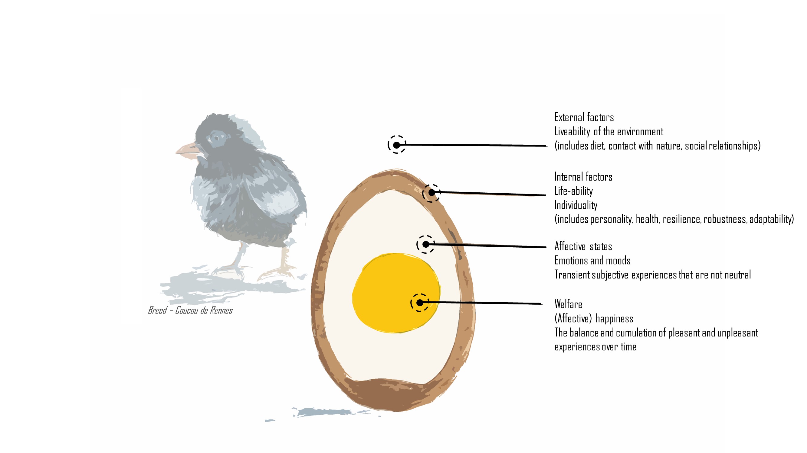 Waar emoties en humeur veelal als synoniem van dierenwelzijn werden gezien, vormen ze in het welzijns-ei meer de ingrediënten die bijdragen aan de welzijnstoestand. Deze welzijnstoestand is dan de balans van de frequentie en cumulatieve positieve en negatieve ervaringen gedurende een bepaalde periode. Met andere woorden: als het dier veelvuldig positieve ervaringen heeft en weinig negatieve ervaringen, kan het welzijn van dit dier gezien worden goed. Hetzelfde geldt voor mensen: de gelukkigste mensen hebben veelvuldig lichte positieve emoties.
