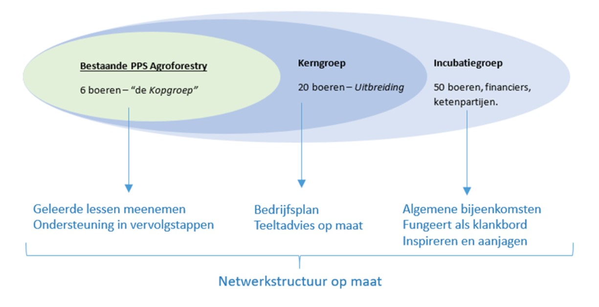 Voor de nieuwe kerngroep (20 bedrijven) zal een bedrijfsplan worden gemaakt, bestaande uit een bedrijfsanalyse, een beplantingsplan en financiële doorrekening. Zij zullen binnen 1 á 2 jaar bomen planten op hun bedrijf en op een aantal van deze bedrijven zal ook monitoring plaats gaan vinden.De selectie van deze 20 bedrijven wordt gedaan met inspraak van de co-financierende provincies en in dienst van kwaliteit van het project. De kopgroepbedrijven delen hun ervaring met de bedrijven uit de bredere kerngroep. De ervaringen van de kerngroepbedrijven worden ook weer geregistreerd en gedeeld met de telers uit zowel de eigen groep als de telers uit de incubatiegroep. Bij een deel van de kerngroepbedrijven zal ook een pakket aan waarnemingen en registratie (ecosysteemdiensten, opbrengsteffecten, arbeid) worden opgezet, om de gekwantificeerde kennis te vergroten.