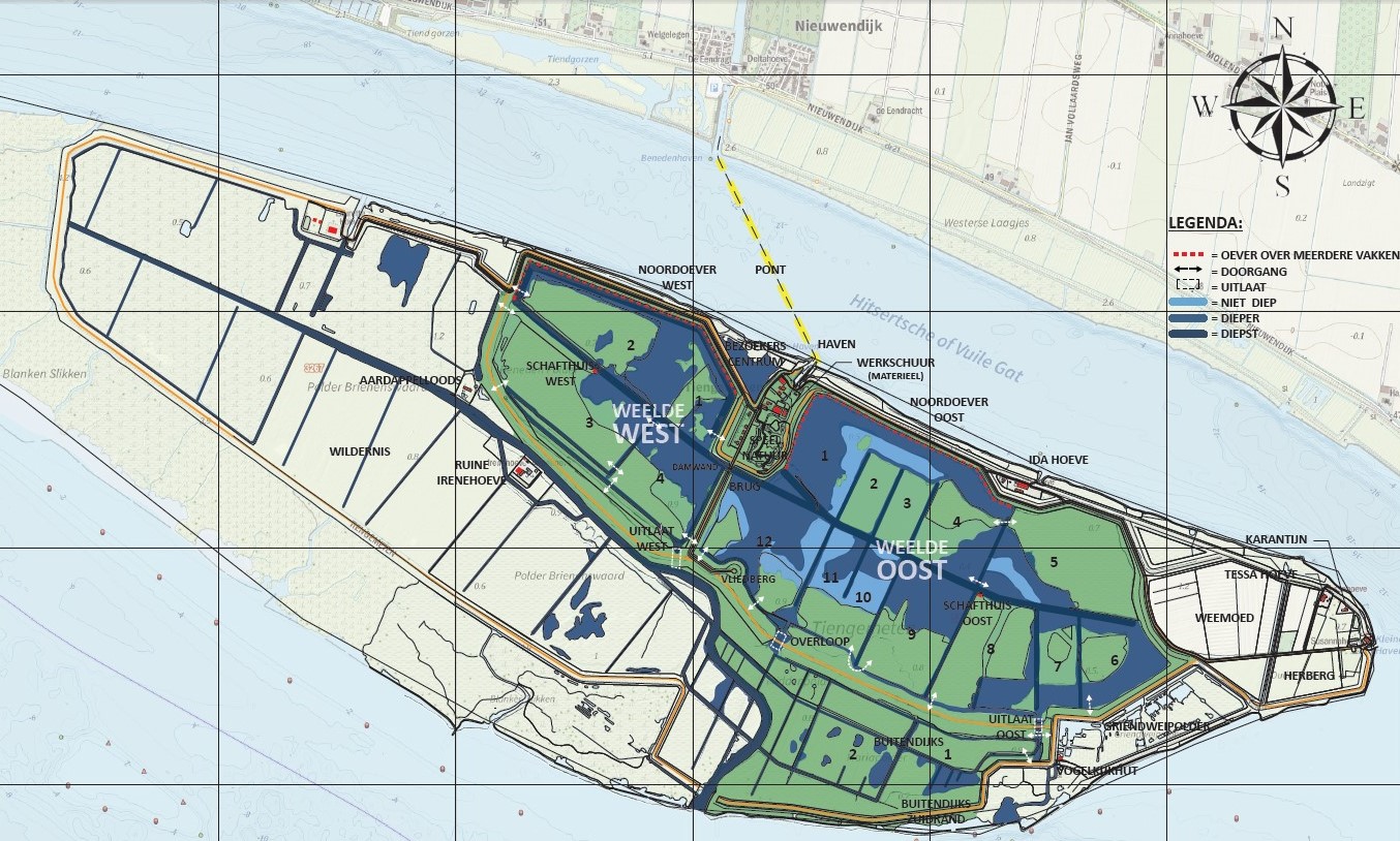 Gebiedsbeschrijving: Verspreid voor over het eiland komen groeiplaatsen voor. Groeiplaatsen komen voornamelijk voor in het kommoeras (wat alleen bij hoog water in contact staat met het Haringvliet) en in ook in het intergetijdenlandschap. Dit gebied is blauwgroen gearceerd op het kaartje.